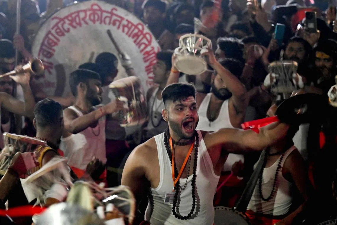 Traditional clarinets played devotional music during the rituals for the statue, which represents the god-king, while politicians, businessmen, sports and media stars watched along with millions nationwide. Thousands of saffron-clad people danced in the streets, waving saffron flags as they chanted religious slogans.