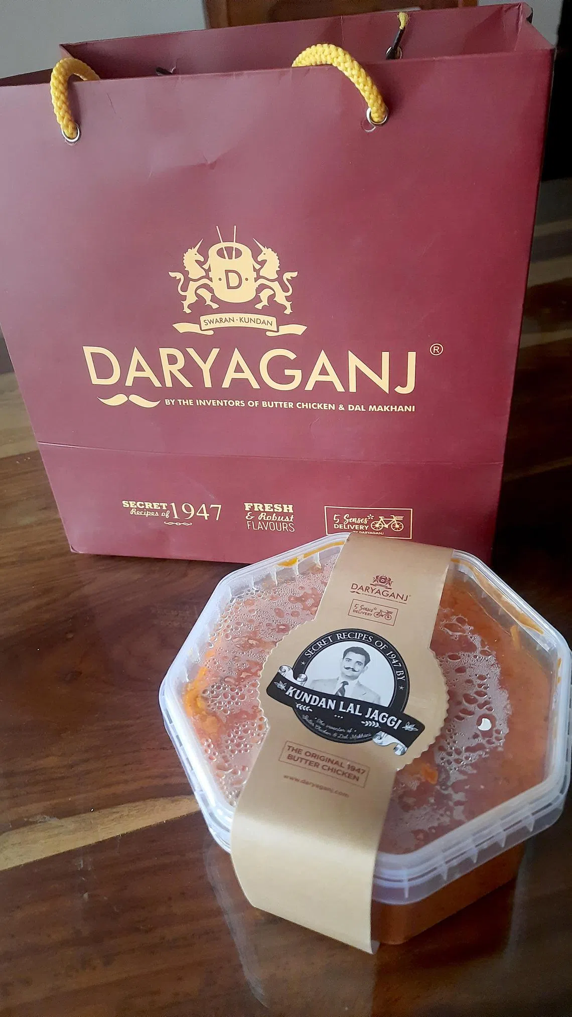 A takeaway order of butter chicken from Daryaganj Restaurant.