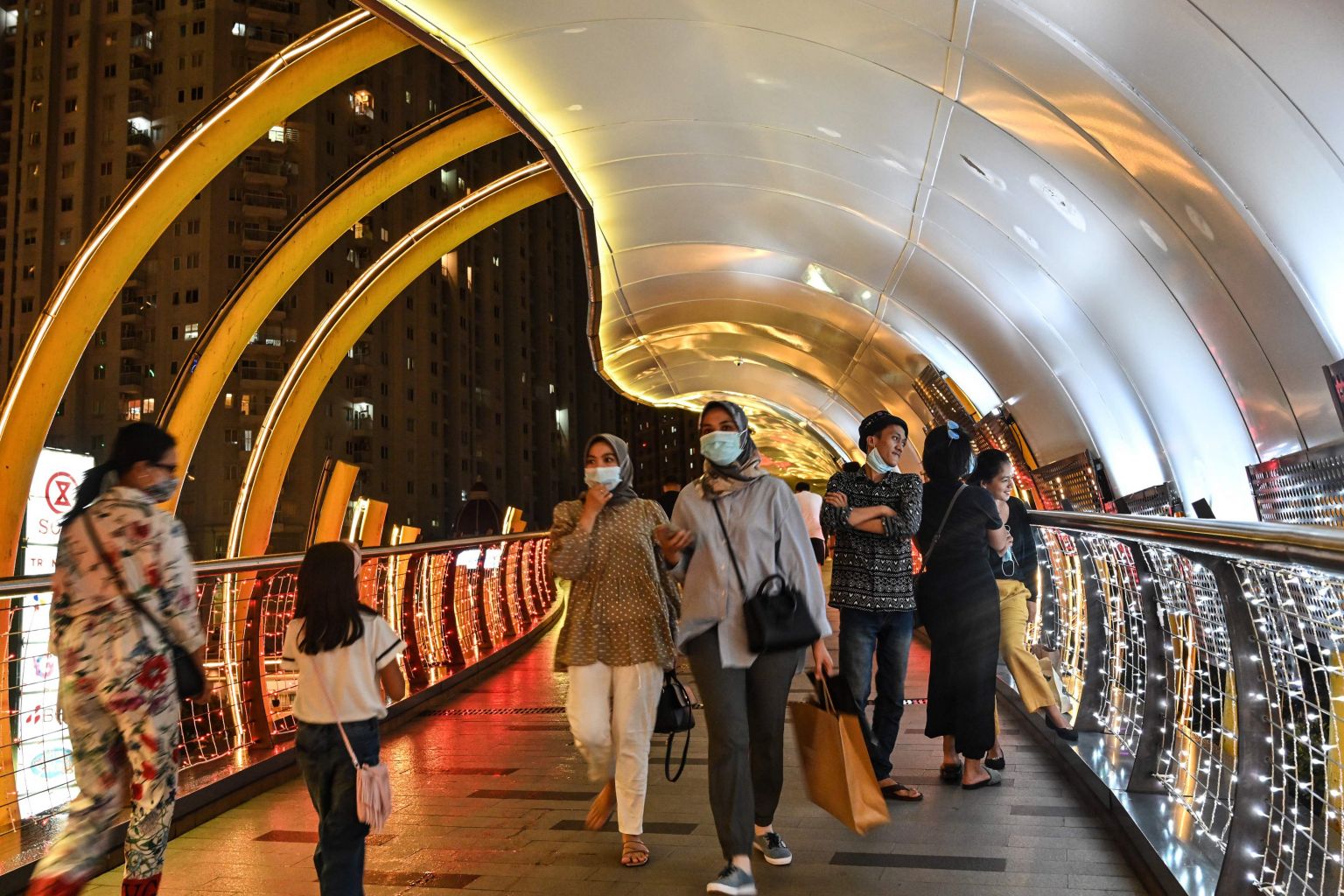 People walk along a bridge in Jakarta on Feb 14, 2021.