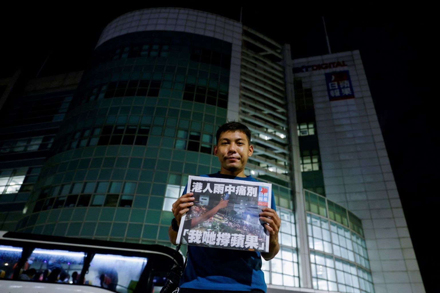 Apple Daily photographer Harry Long poses with the final edition of Apple Daily at its headquarters in Hong Kong