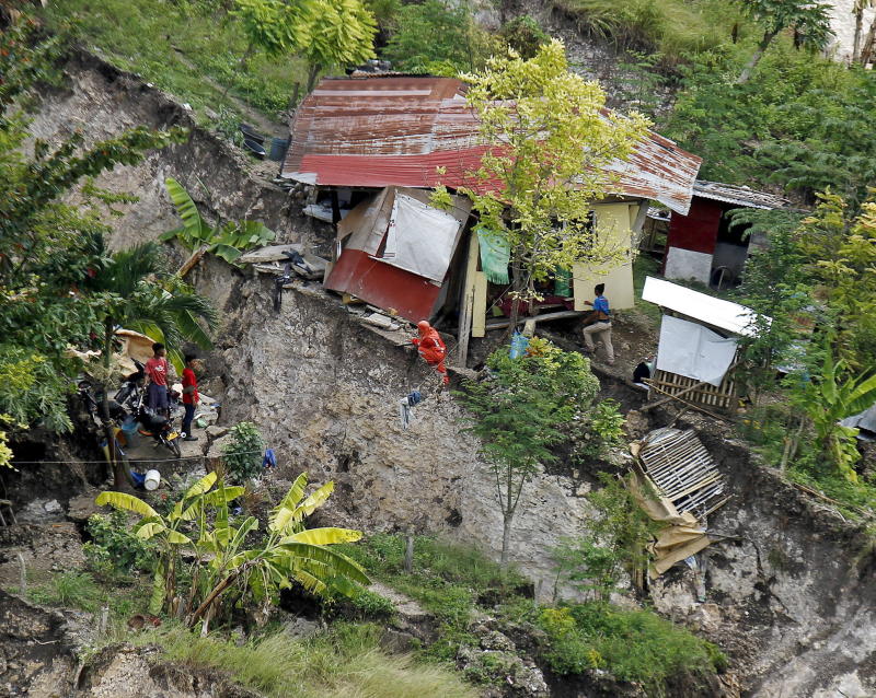 Filipino villagers and rescuers inspect a damaged home after a landslide in Naga city, Cebu province, Philippines, on Sept 22, 2018.