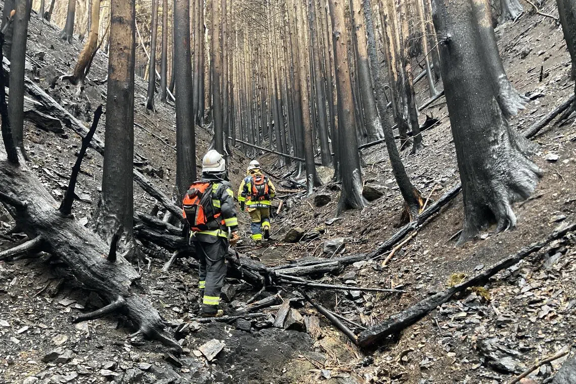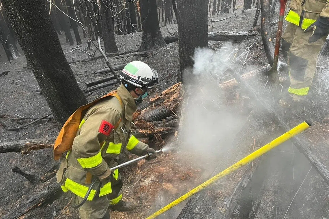 Firefighters at work in a wildfire-affected forest in Ofunato, Iwate prefecture, Japan on March 6, 2025.