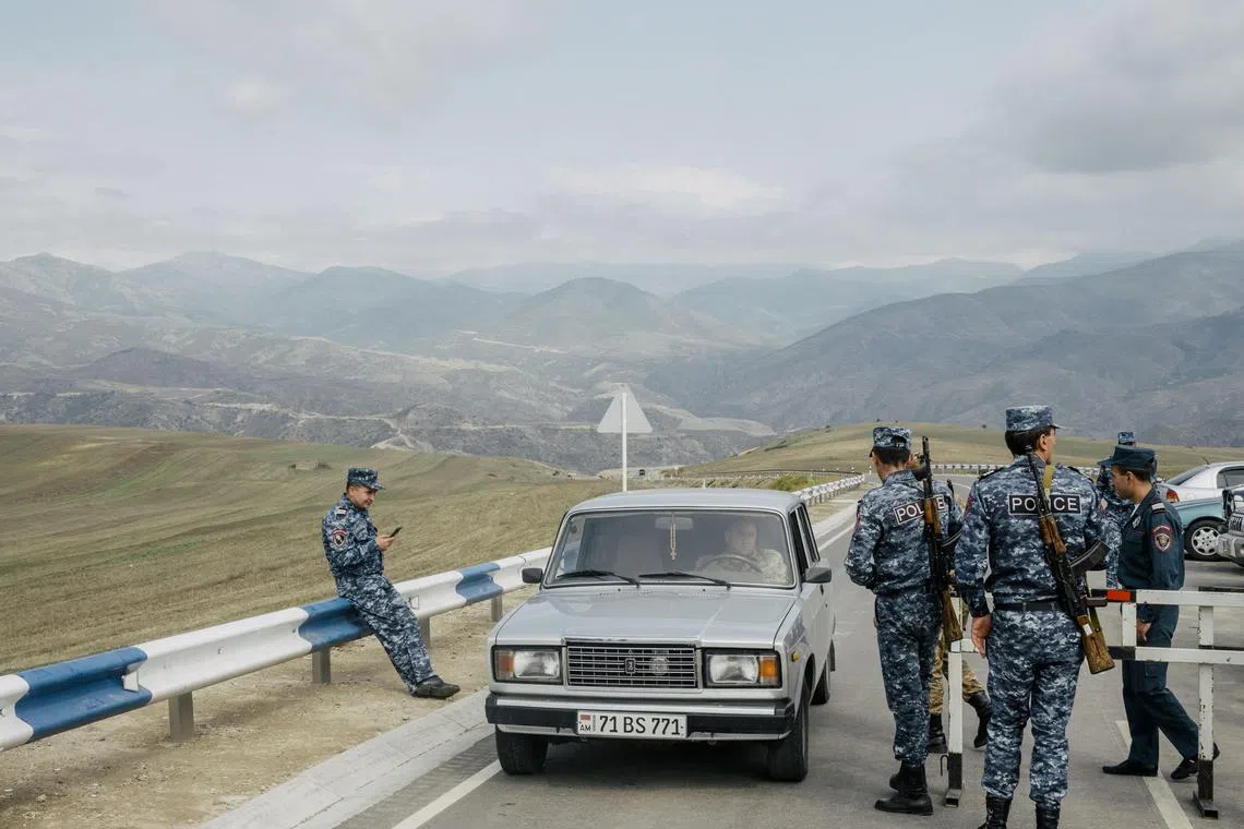 The Armenian police at a border post on the road leading from Armenia to the Nagorno-Karabakh region, near the village of Kornidzor, Armenia.