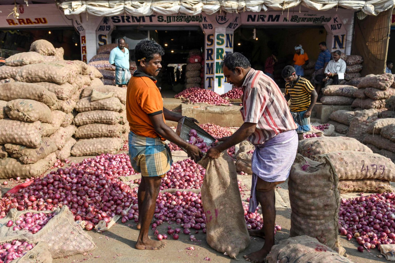 Labourers fill a bag with onions as farmers and traders negotiate prices at a wholesale vegetable market in Chennai, India, on Feb 1, 2020.