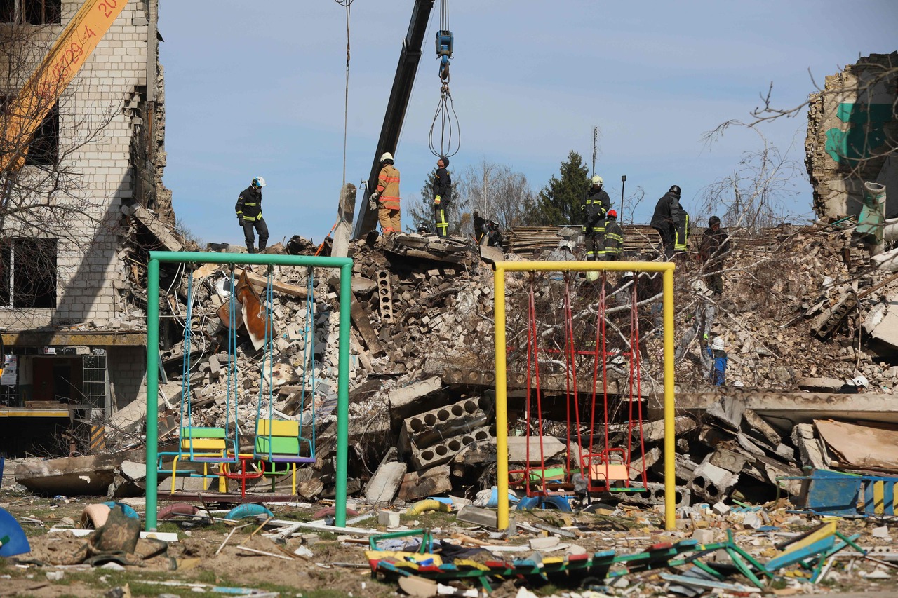 Rescuers remove rumbles of a damaged building in the town of Borodianka, northwest of Kyiv, on April 7, 2022.