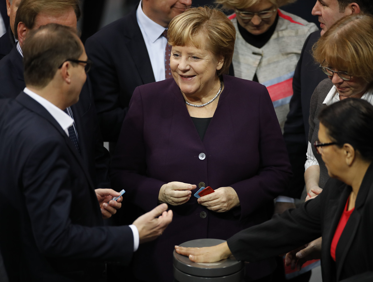 German Chancellor Angela Merkel about to cast her vote on the federal 2020 budget following a debate at the Bundestag, the lower house of parliament, on Nov 29, 2019 in Berlin.