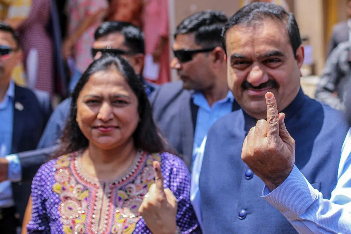 Mr Gautam Adani, chairman of Adani Group, right, and his wife Priti Adani, chairperson of Adani Foundation, show their fingers marked with indelible ink after casting their ballots at a polling station.