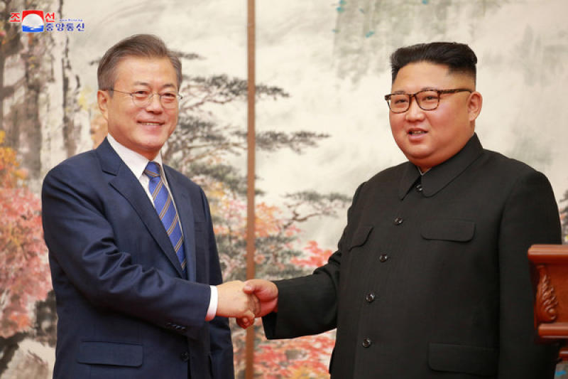 South Korean President Moon Jae-in and North Korean leader Kim Jong Un shake hands during their joint news conference in Pyongyang on Sept 19, 2018.