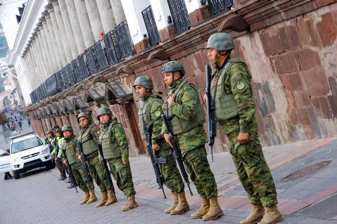 Soldiers stand guard outside the presidential palace, following a wave of violence around the nation that prompted President Daniel Noboa to declare gangs to be terrorist organisations to be hunted by the military, in Quito, Ecuador.