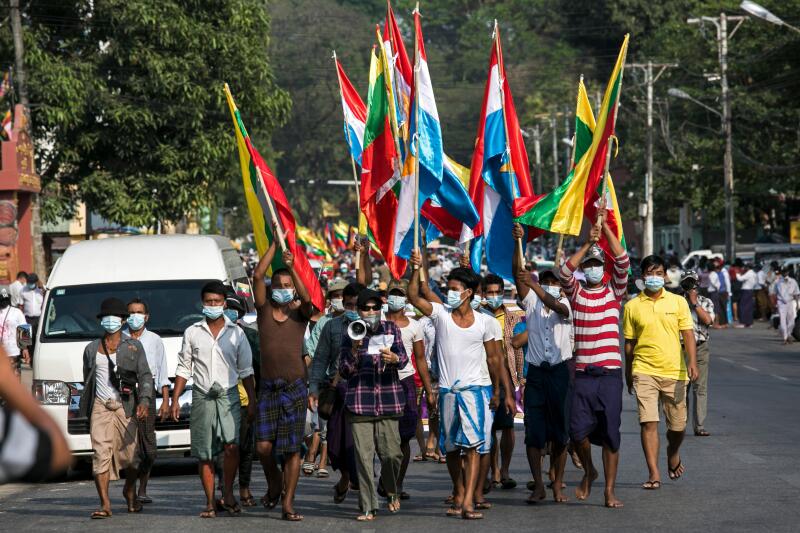 About 300 people marched through Yangon on Jan 30, 2021, against foreign intervention in the country's internal affairs.