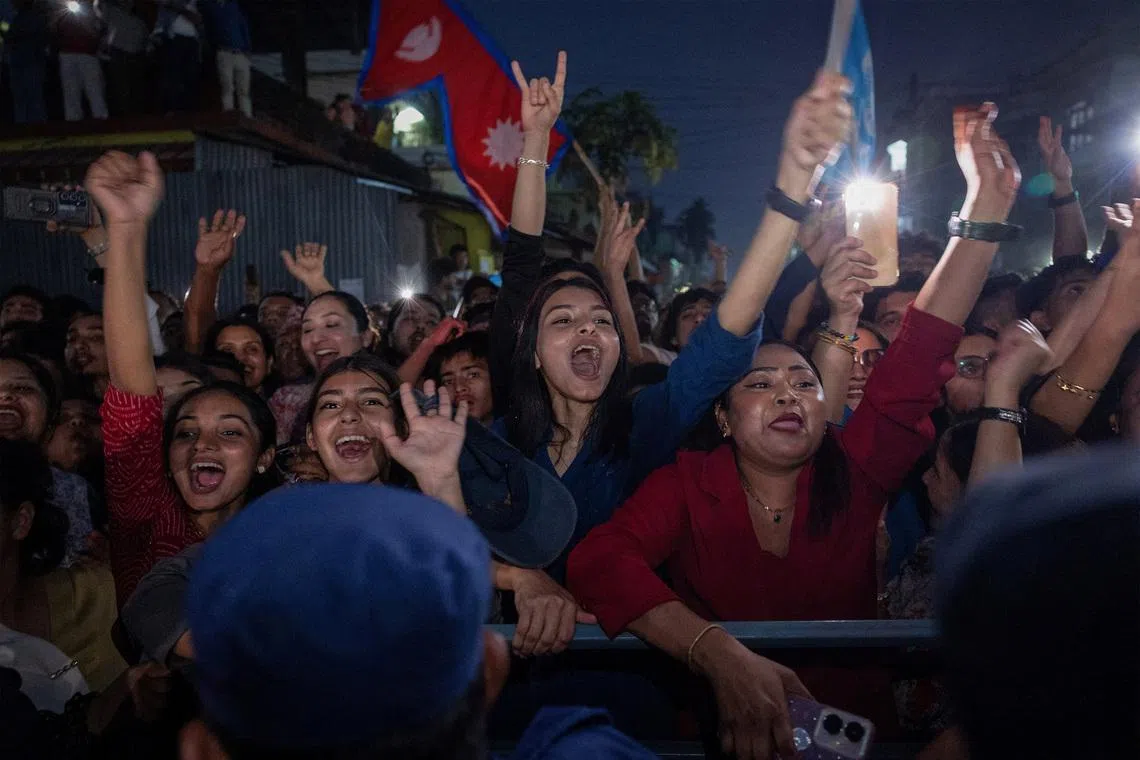 Supporters of Balendra Shah, a rapper-turned-politician, celebrate after Shah won the election, in Damak, Jhapa district, Nepal, on March 7.