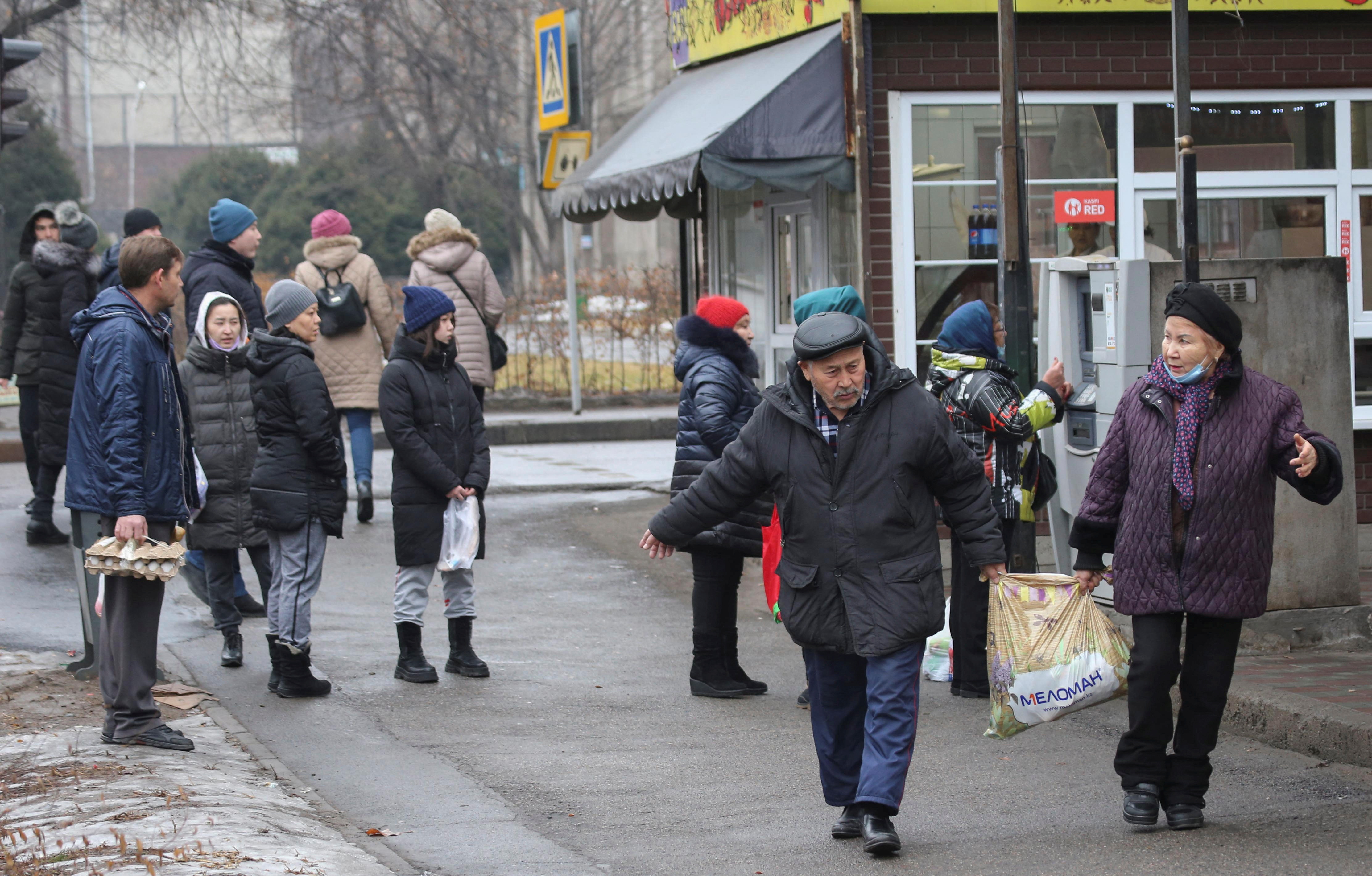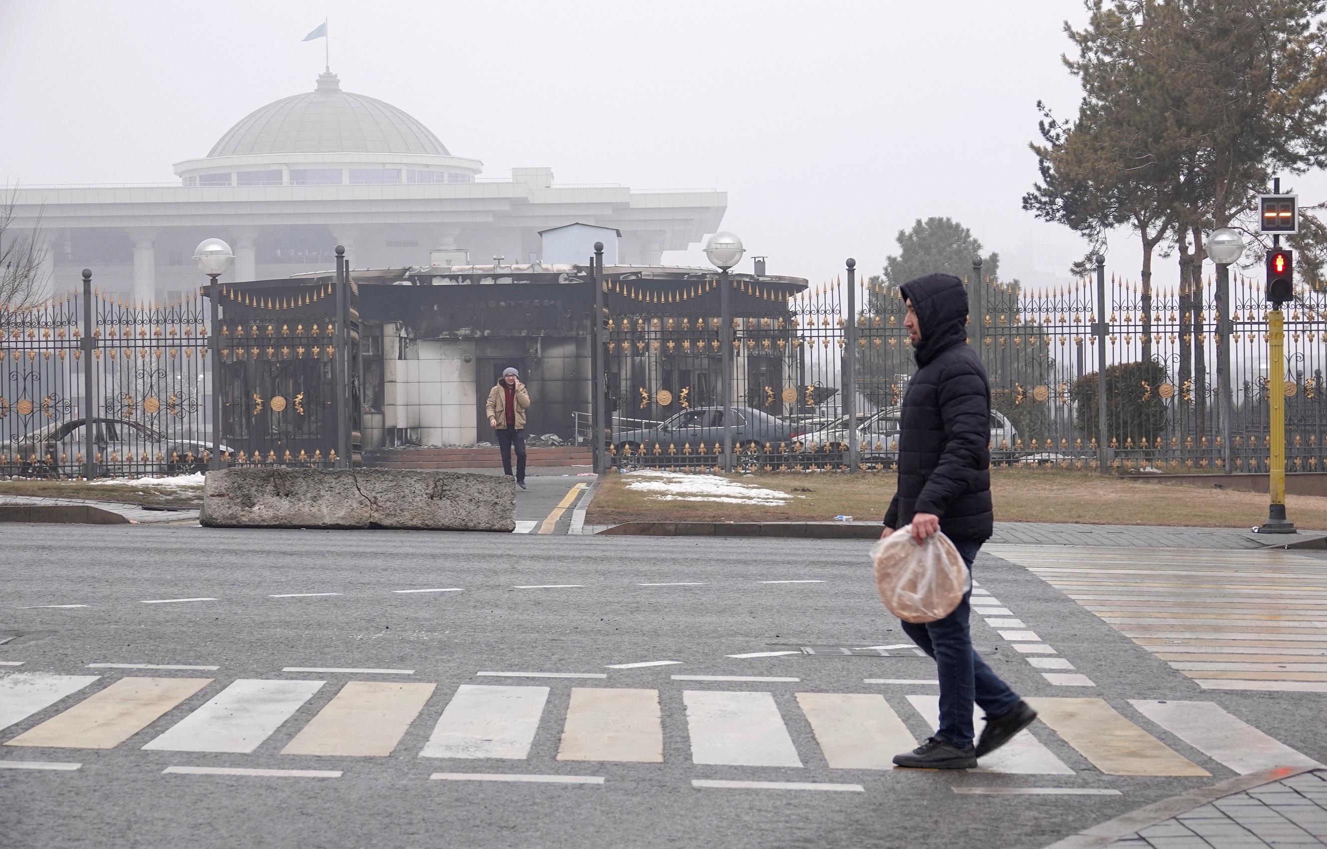 People walk near the presidential residence following protests triggered by a fuel price increase in Almaty, Kazakhstan, on Jan 7, 2022.