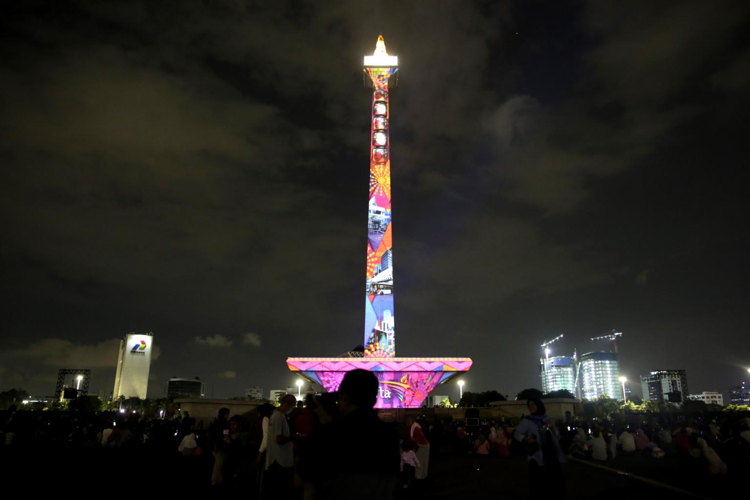 Residents look at a light projection at a national monument in Jakarta, Indonesia, on Dec 30, 2019.