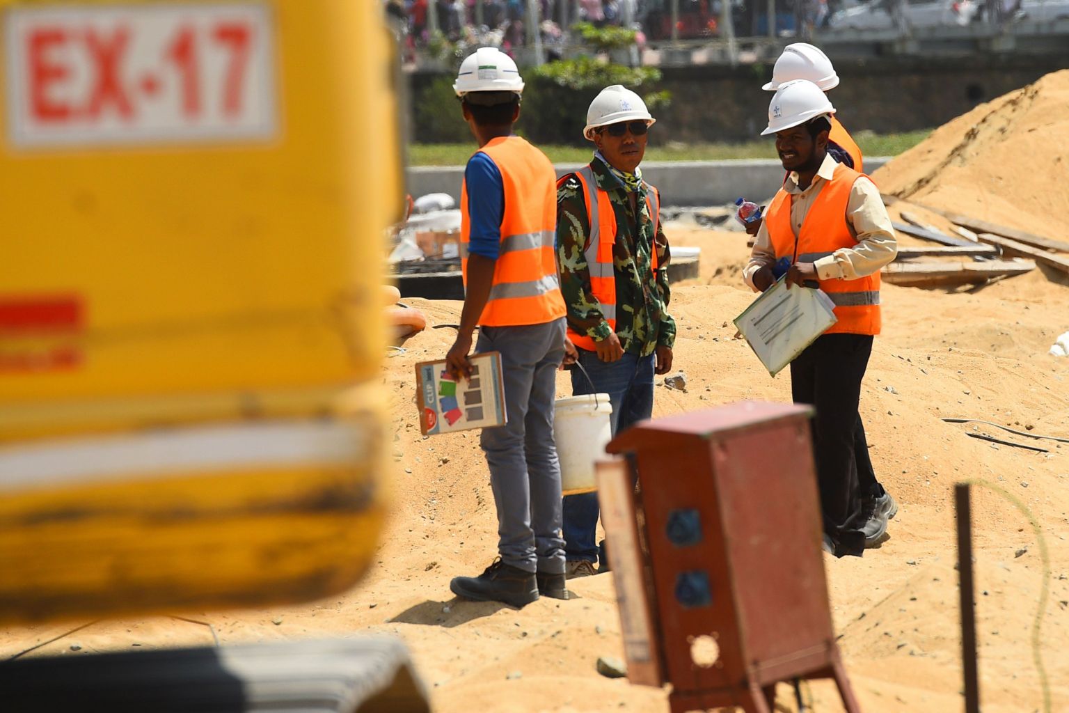 In a photo taken on Feb 24, 2020, Chinese and Sri Lankan labourers work at a construction site on reclaimed land, part of a Chinese-funded project for Port City, in Colombo.