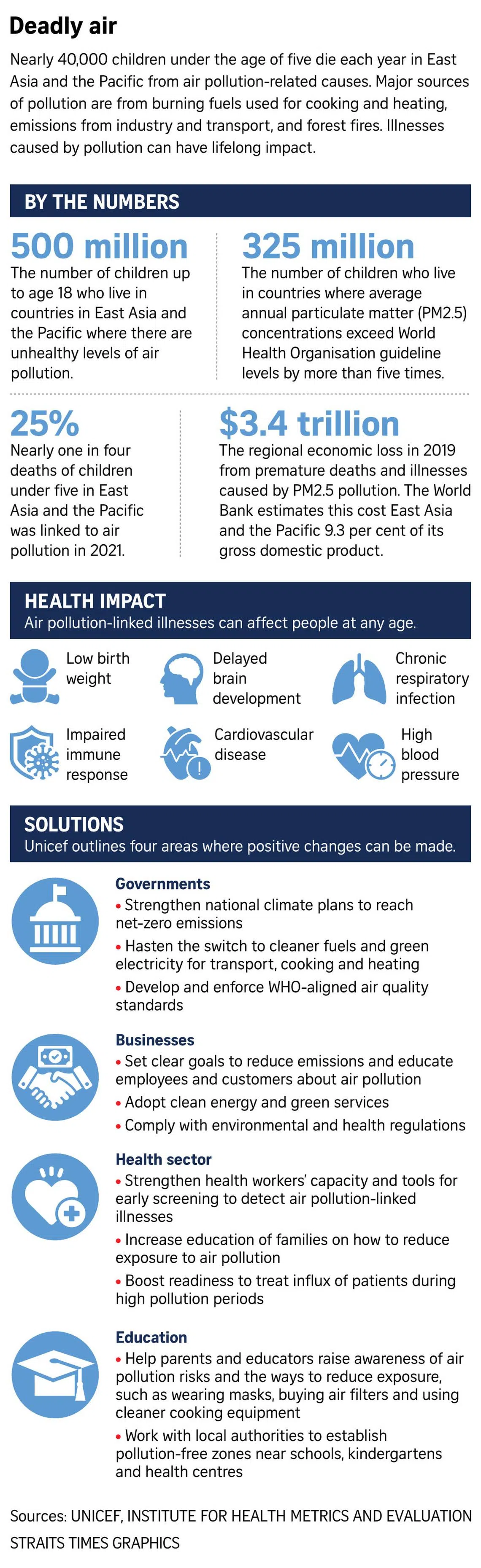 SINGAPORE – More than 100 children under the age of five die each day in East Asia and the Pacific from air pollution-related causes, said Unicef on Feb 6, in a call for urgent action to cut deadly emissions, toughen air quality standards and improve health systems.