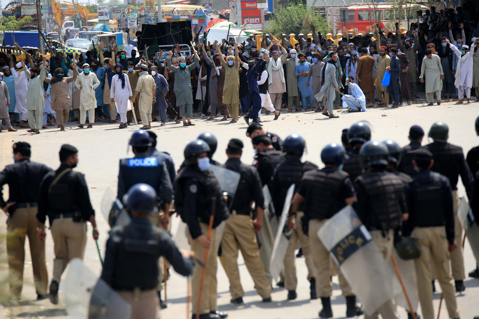 Police clash with supporters of Islamic political party Tehreek-e-Labbaik Pakistan, in Peshawar, Pakistan, on April 13, 2021.