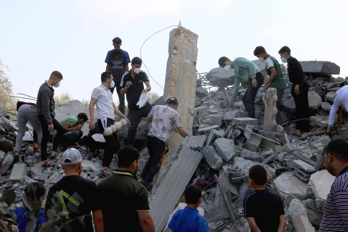 Palestinians search the rubble following an Israeli strike on Rafah city, in the southern Gaza Strip, on Oct 14.