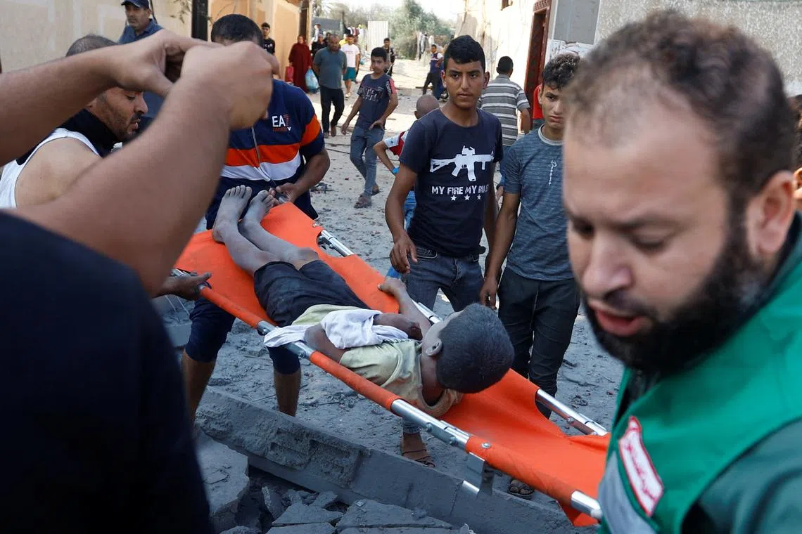 Palestinians carry an injured boy rescued from the rubble in the aftermath of Israeli strikes, in Khan Younis in the southern Gaza Strip, on Oct 14.