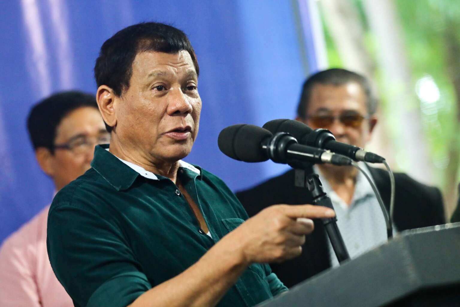 Filipino President Rodrigo Duterte (centre) speaking during a visit to troops, in Iligan city, Mindanao island, southern Philippines, on May 26, 2017.