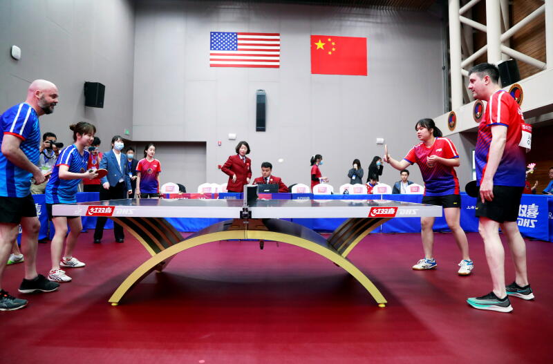 US and Chinese players take part in a friendly table tennis match during an event to mark the 50th anniversary of the ping pong diplomacy between China and the United States, in Shanghai, China, on April 10, 2021.