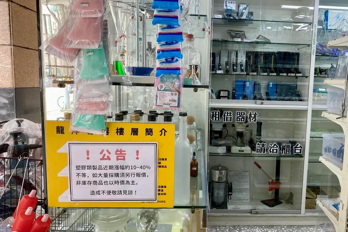 When this reporter visited plastics wholesalers in Taipei, several had put up signs indicating that prices of their goods have recently shot up by up to 40 per cent. Certain non-inventory items would also see their prices fluctuate according to daily rates, the signs read.