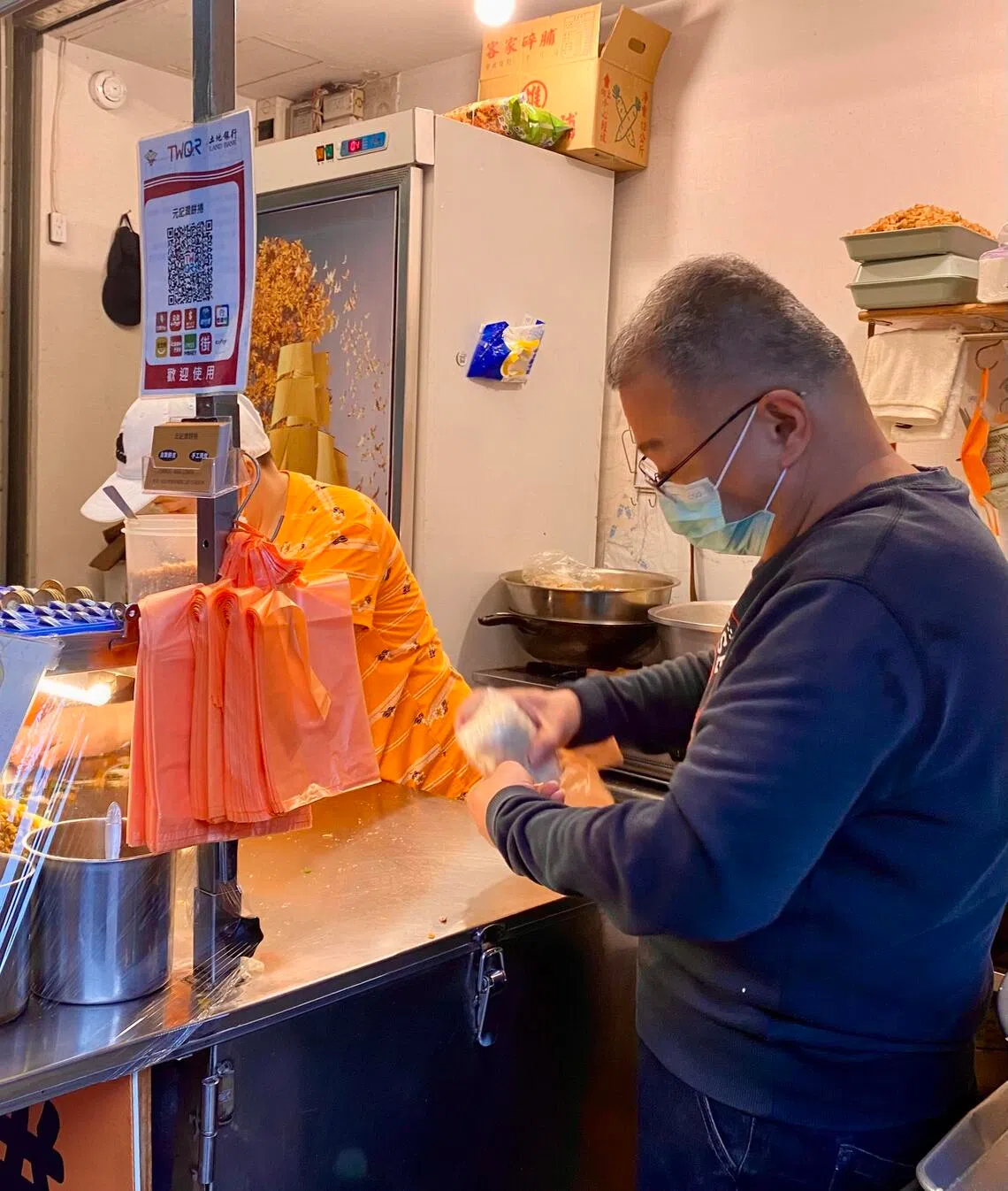 A popiah vendor in Taipei packing food into a plastic bag.