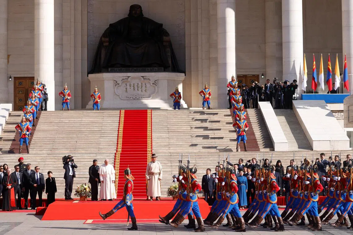 Pope Francis at a welcome ceremony with President Ukhnaagiin Khurelsukh at Sukhbaatar Square in Ulaanbaatar, Mongolia on Sept 2.