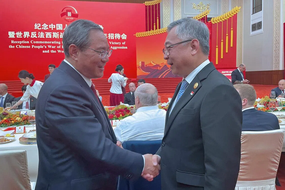 Deputy Prime Minister Gan Kim Yong meeting Chinese Premier Li Qiang at a gala lunch at the Great Hall of the People in Beijing, after attending the military parade on Sept 3.
