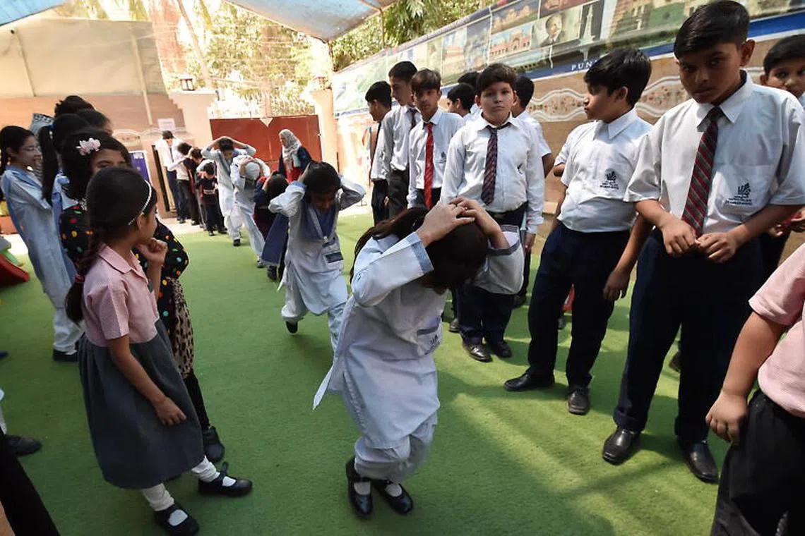 Pakistani school students taking part in a mock drill in Karachi on May 9.