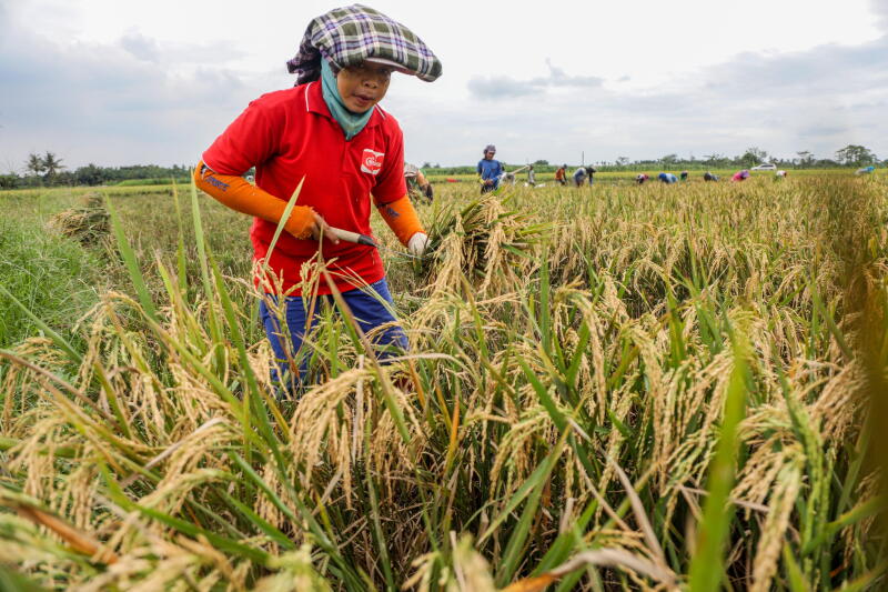 An Indonesian farmer harvests rice in her paddy field during a harvest day in Deli Serdang, North Sumatra, Indonesia, on March 24, 2021.
