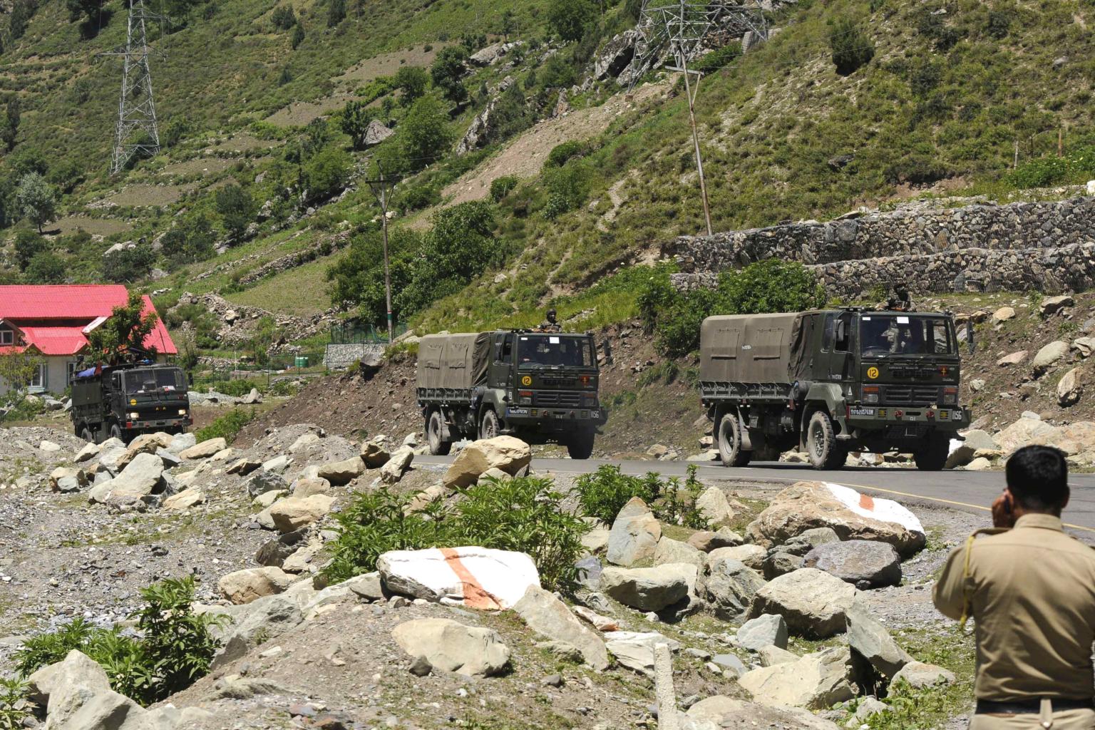 Indian army trucks along a highway in Gagangeer, India, on June 22, 2020.
