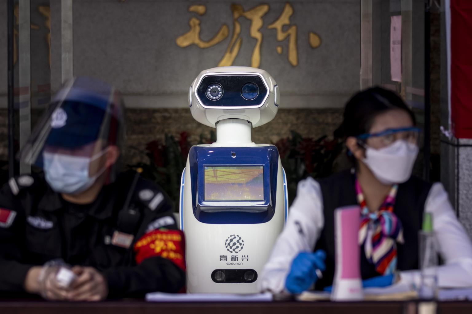 In a photo taken on Feb 26, 2020, a robot checks visitors' body temperatures at the entrance of a government building in Guangzhou, China.