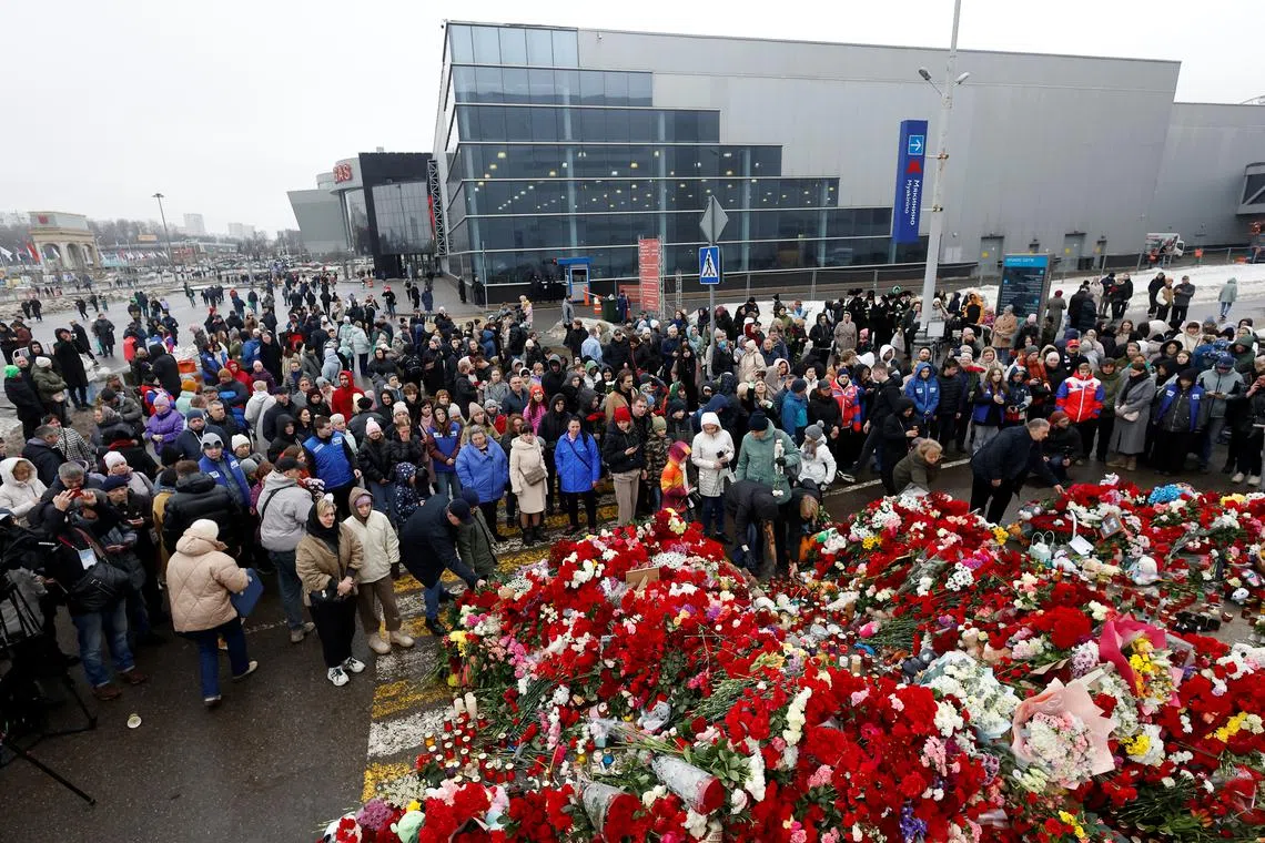 People laying flowers at Crocus City Hall on March 24.