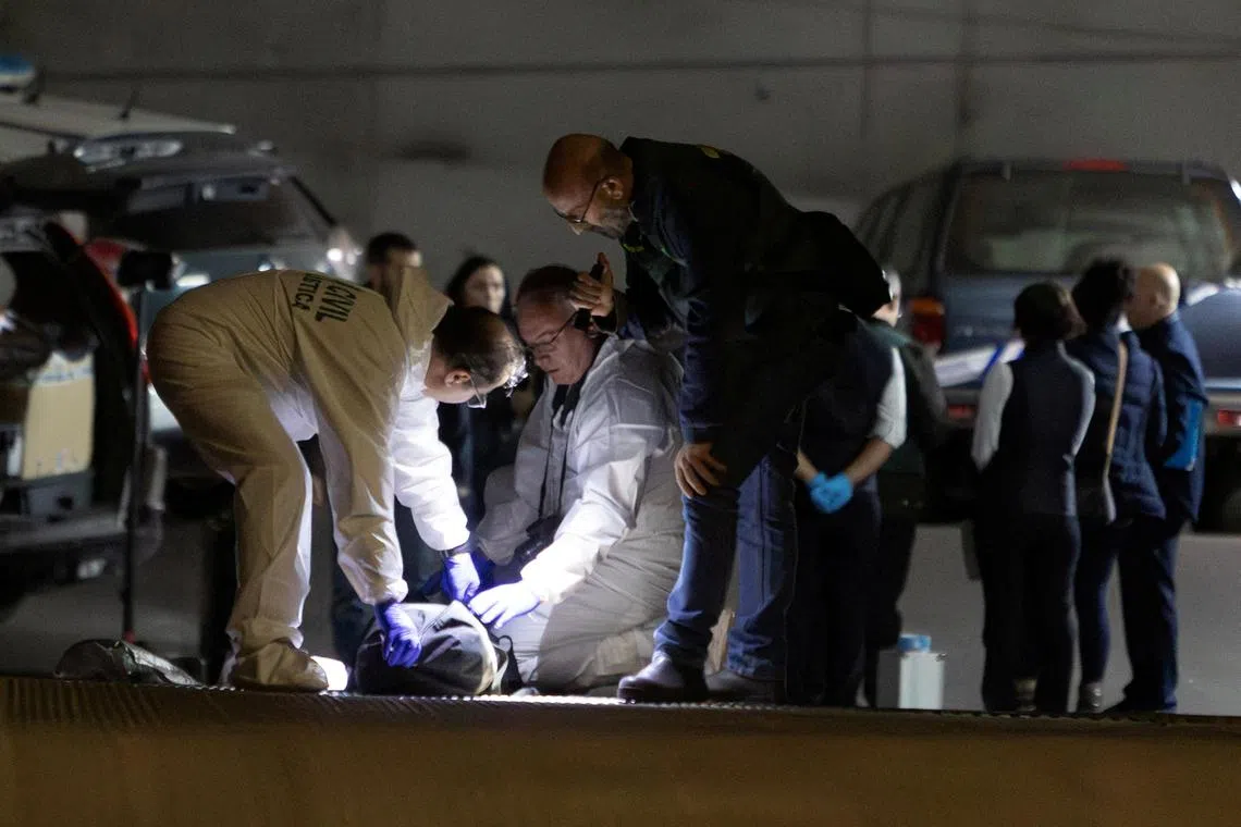Spanish Civil Guard officers investigating the garage where the body of Russian pilot Maxim Kuzminov was found after he was shot dead, in Villajoyosa, Spain.