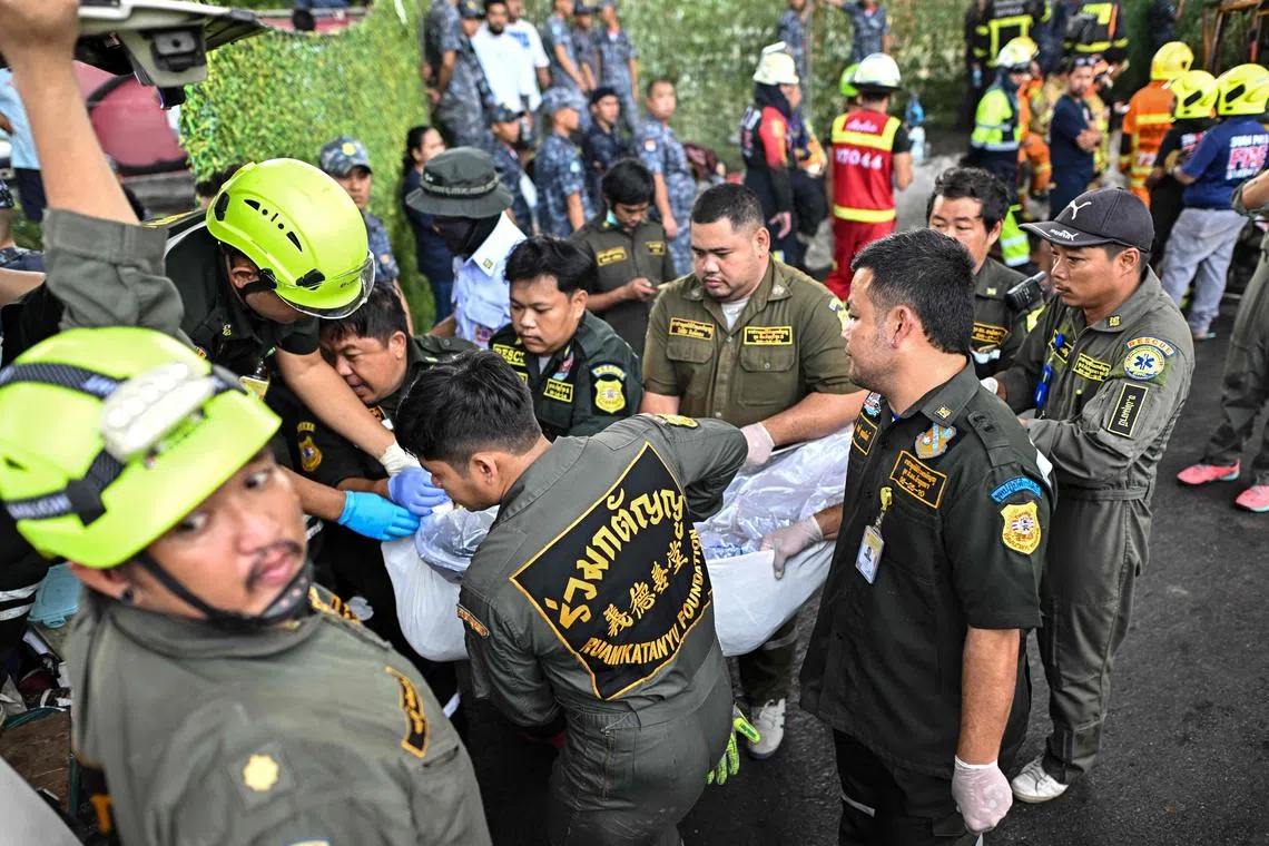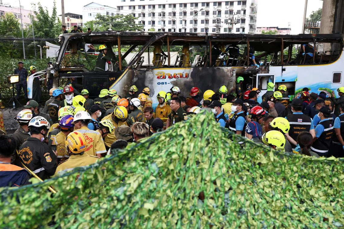BANGKOK – Rescuers worked to recover children’s bodies from the charred wreckage of a school bus on Oct 1 after an accident turned the vehicle into an inferno, with at least 23 dead.
