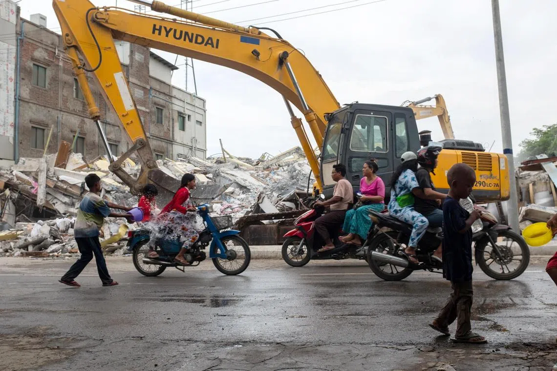 People work on the debris of a collapsed building during the Thingyan (water festival) in Mandalay, Myanmar, on April 14.