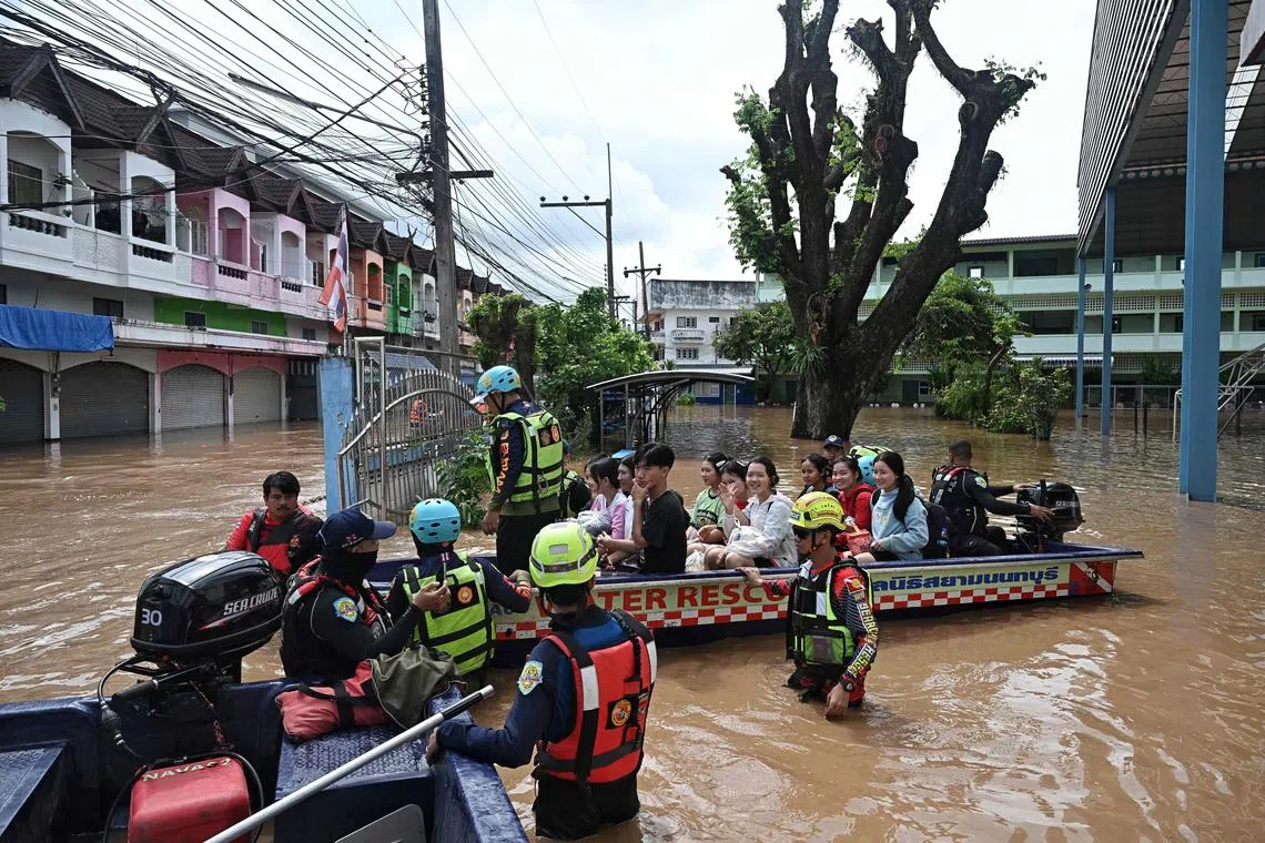 Rescue teams pick up schoolchildren who were trapped overnight in a school during flooding in the northern Thai city of Chiang Rai.
