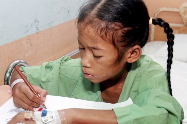 Norieen Yaakob sitting up and colouring at Hospital Raja Perempuan Zainab II. Both Norieen and another Orang Asli girl, Miksudiar Aluj, had survived in the jungle for 40 days without food.