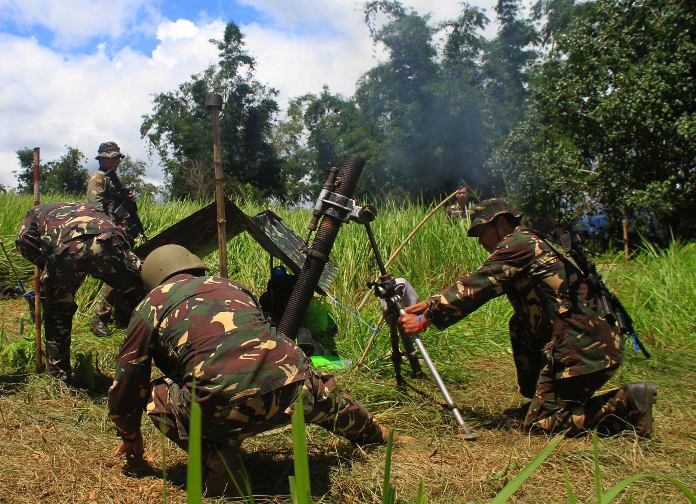Philippine soldiers firing mortar rounds toward Islamic militant positions from Butig town, in the Philippines, on May 29, 2016.