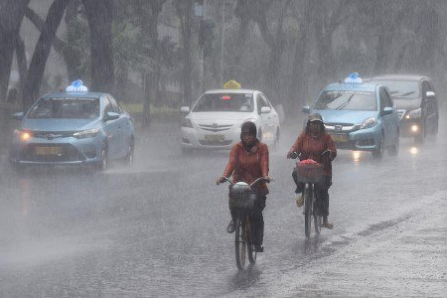 Two people ride bicycles through the rain in Central Jakarta, on June 9, 2016.