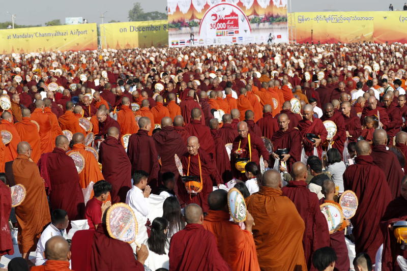 With many barefoot, Buddhist monks from Myanmar and Thailand and senior religious officials from a dozen countries collected alms next to an airport in the central city of Mandalay, that is also a heartland of the faith.