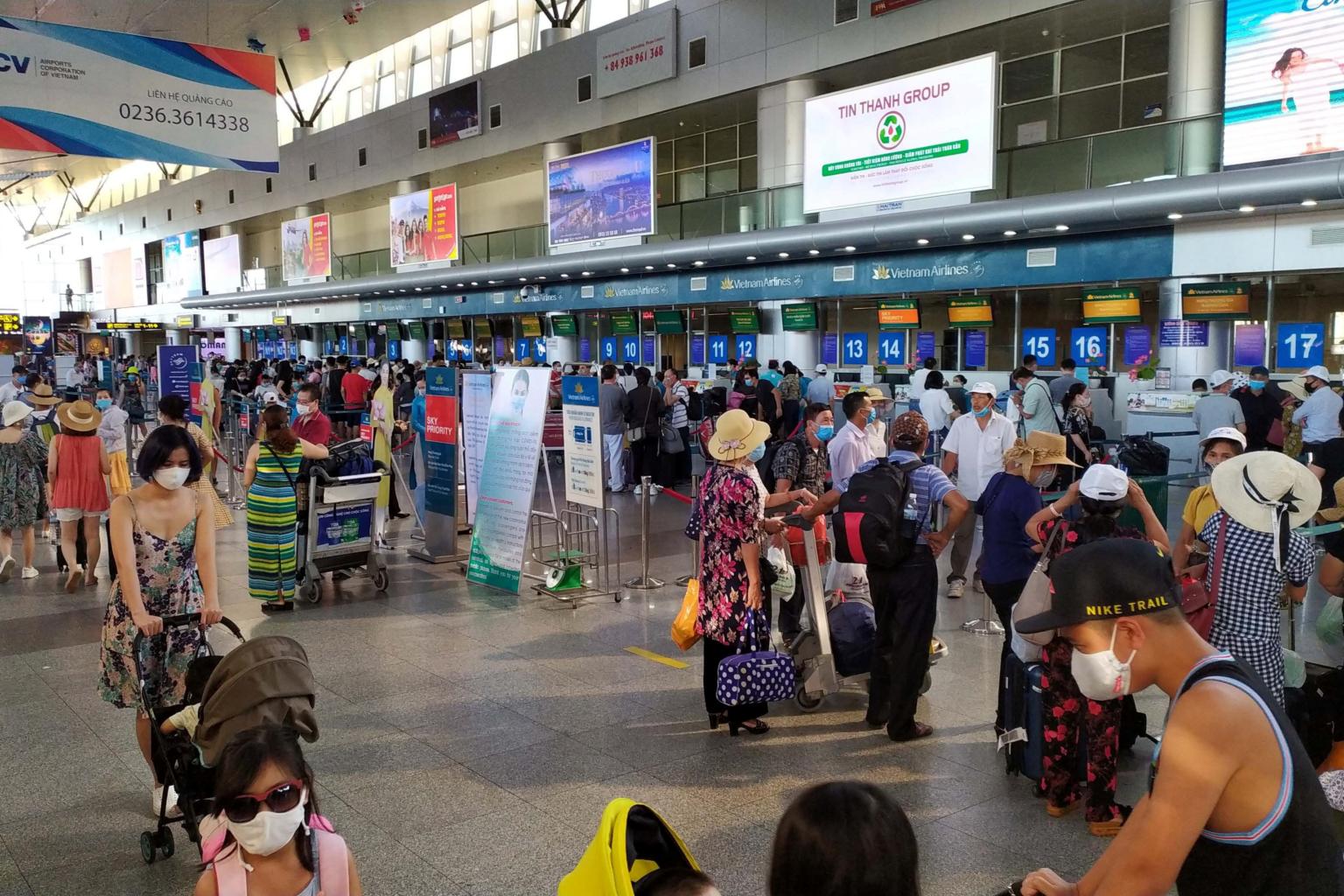 Tourists wait to check-in for departure at Da Nang Airport, Vietnam, on July 26, 2020.