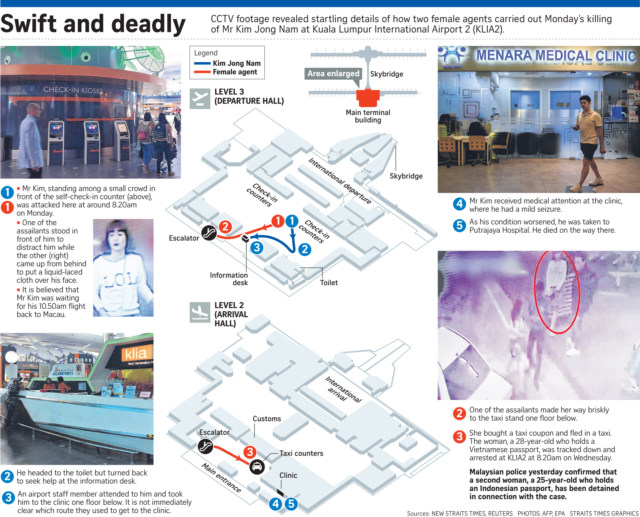 The NST learnt that the assailants moved separately. It is understood that the first female suspect who was arrested at the same airport on Wednesday was the one who had apparently finished the job of killing Kim.