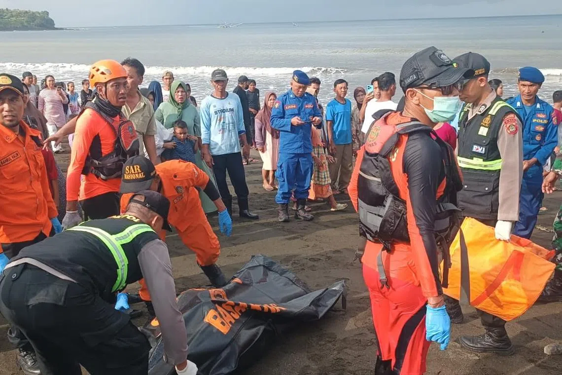 Rescuers carrying a victim in a body bag, after a ferry capsized in the waters off of the Bali strait in Ketapang, Indonesia, on July 3.