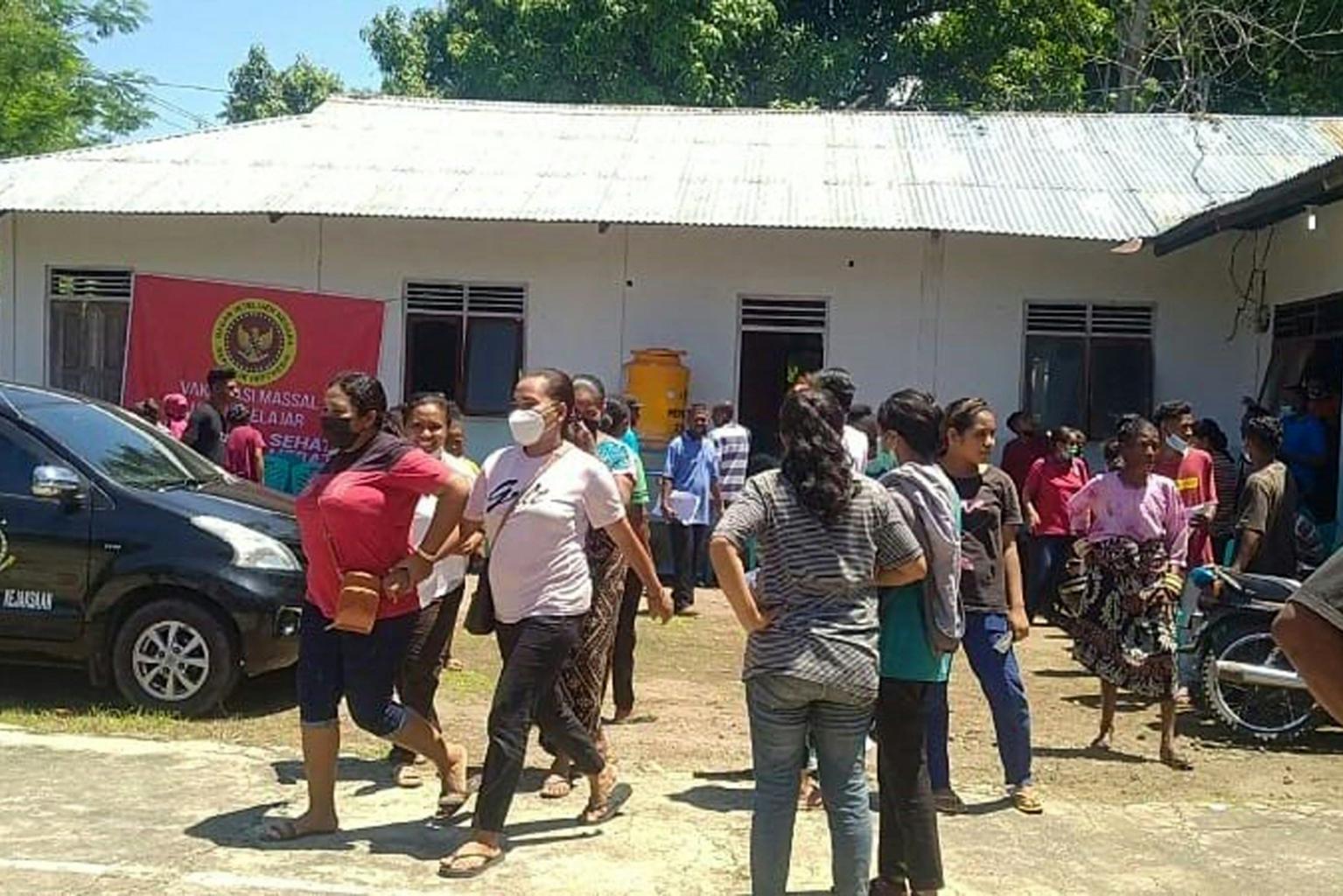Villagers stand outside a building in Flores island after the earthquake struck off the coast in eastern Indonesia, on Dec 14, 2021.