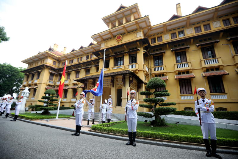 Members of an honour guard participate in the Association of South East Asian Nations (Asean) flag raising ceremony at the Ministry of Foreign Affair in Hanoi, Vietnam, on Aug 8, 2018. The ceremony is to mark the 51st anniversary of the founding of Asean.