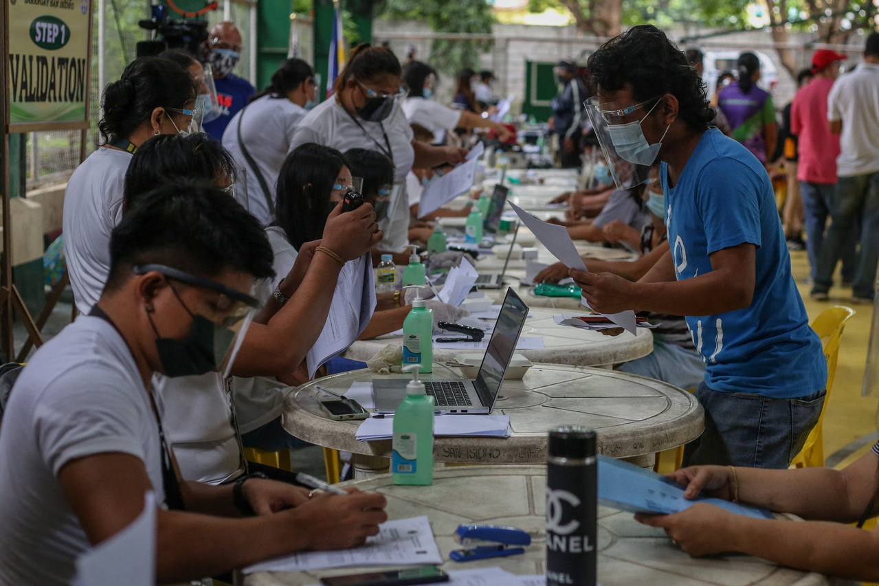 Individuals line up to receive cash aid from the national government during enhanced community quarantine in Manila on Aug 11, 2021.