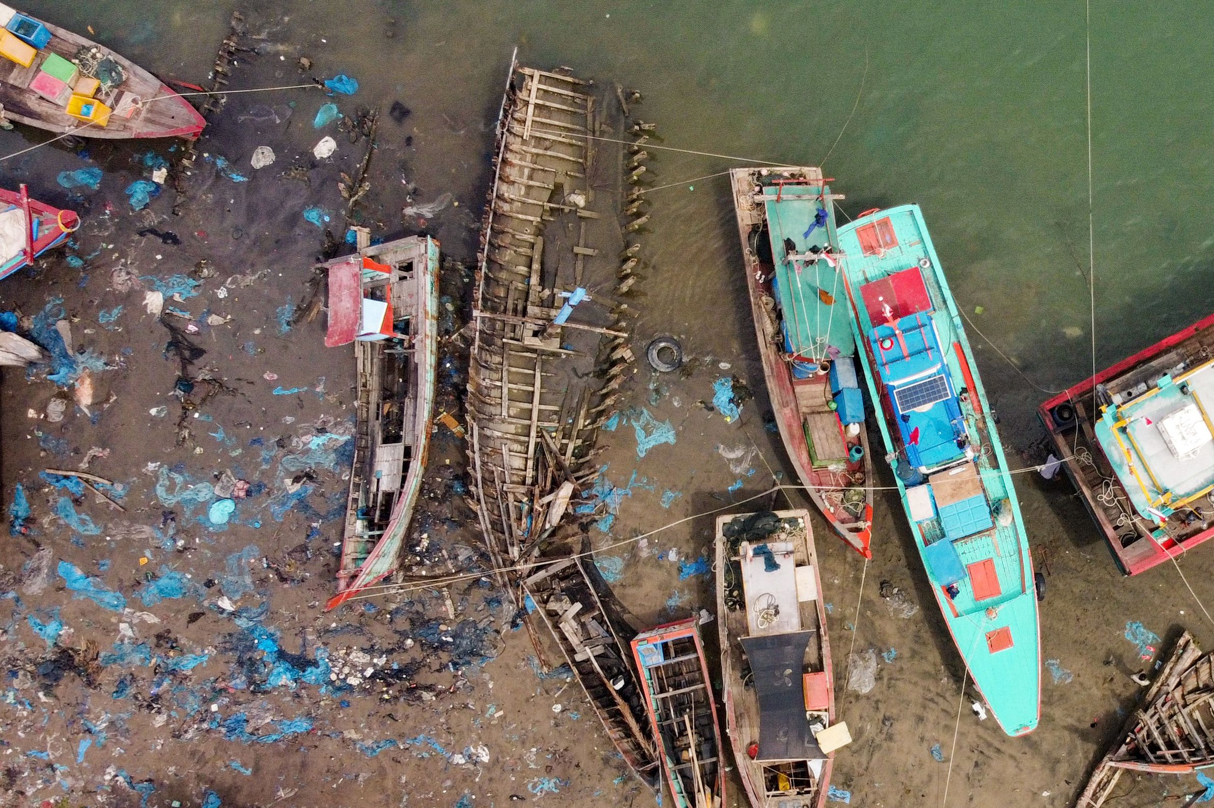 An aerial picture shows garbage including plastic waste floating near fishing boats in various states of disrepair at Pusong village in Lhokseumawe on Oct 8, 2021.