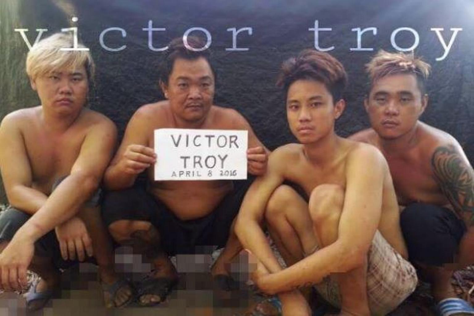 The four kidnapped sailors. "Victor Troy" in the sign refers to a Facebook account under the name "Victor Troy Poz", where the image was first loaded.