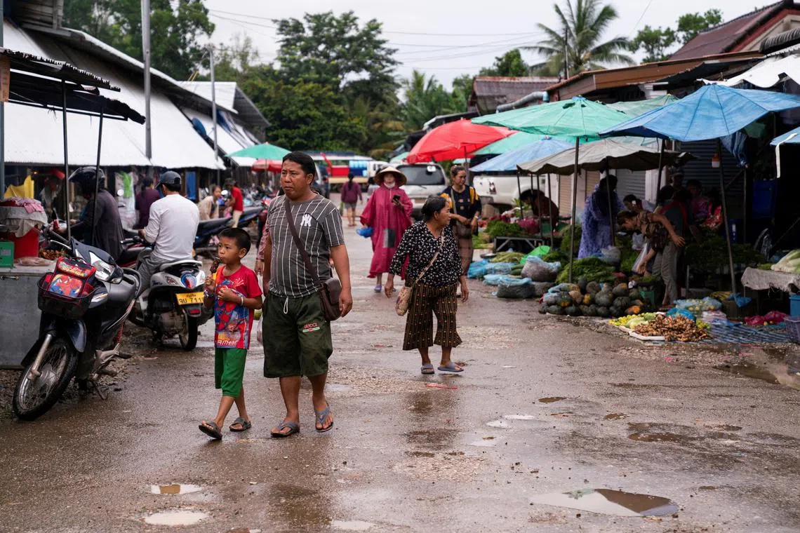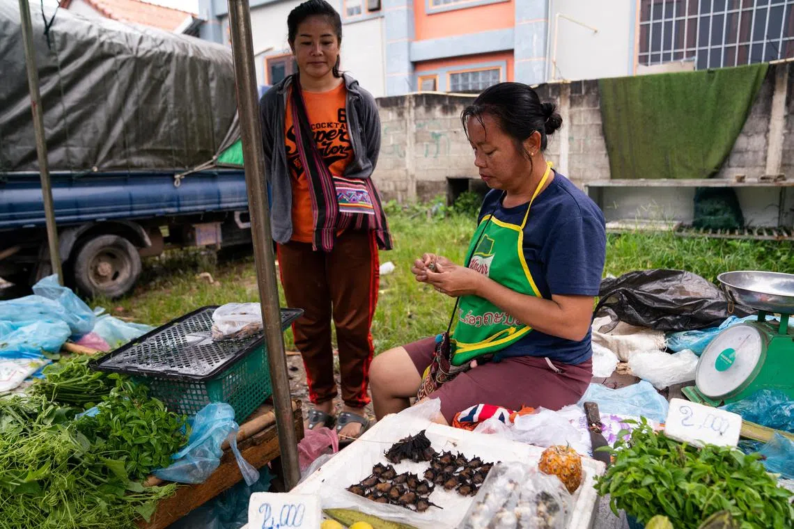 Shoppers buying meat from a stall at a market in Vang Vieng, Laos, in July 2022.